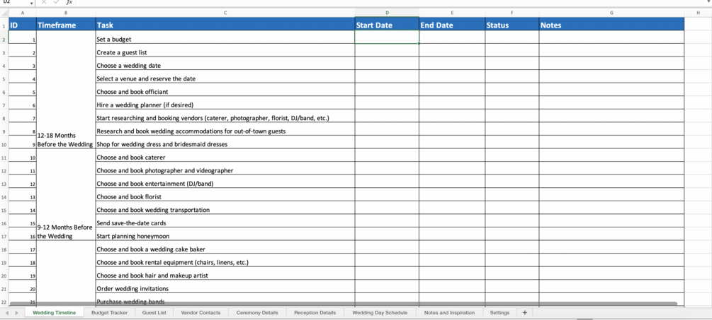 Our wedding planner digital asset features five essential sheets: Wedding Timeline, Budget Tracker, Vendor Contact List, Ceremony Details, and Reception Details. Each sheet is carefully crafted to help you stay organized and on top of your wedding planning game. You'll have access to a detailed list of tasks and a wedding day schedule, ensuring that your wedding day runs smoothly from start to finish.
